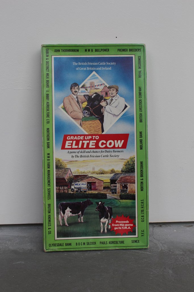 Cast concrete wedges / steel frames / sheet aluminium screen printed with FIL cattle marker / Lining Paper / Museum of English Rural Life artefact ‘Grading up to Elite Cow’ board game