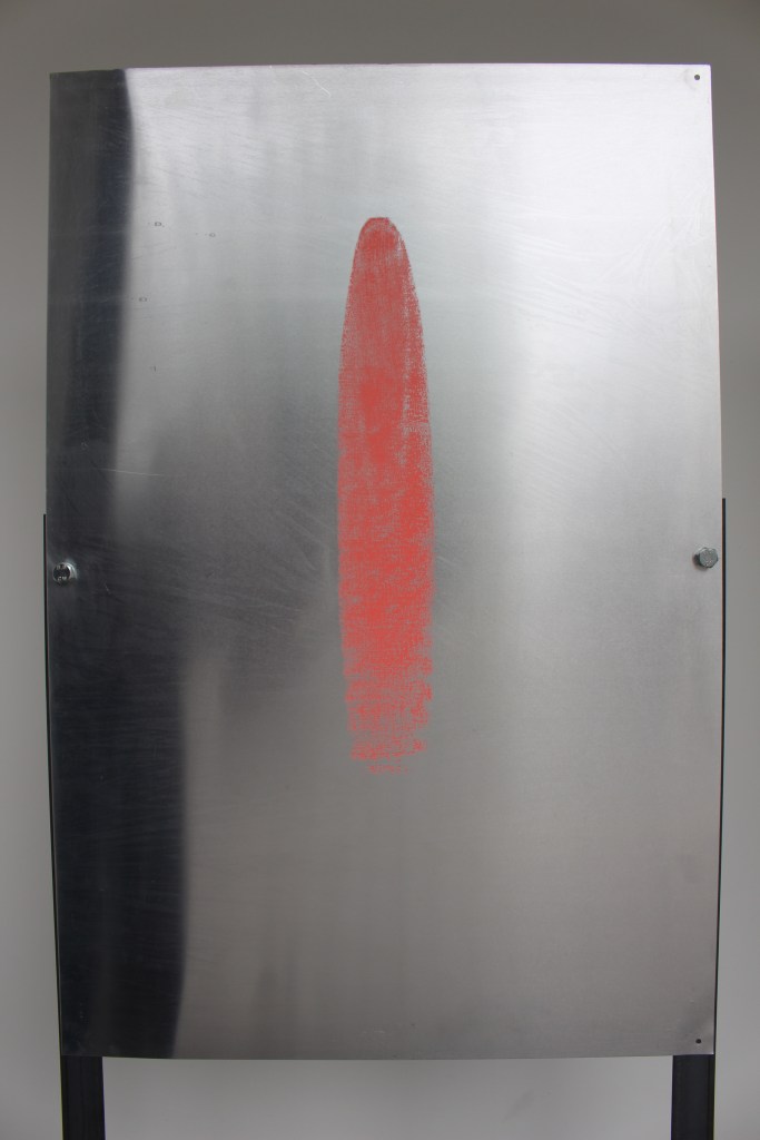 The work in “Smeared” represents a continued investigation into the unique properties and vibrant colour of cattle markers. These works explore cattle marker through the process of screen printing onto paper and aluminium. Cattle marker is used in dairy farming to detect when cows are on heat, and therefore ready to be served. Additionally featured in this install is a copy of the 1980s ‘Grading Up to Elite Cow’ board game which is a monopoly style cattle breeding game on loan from the Museum of English Rural Life, University of Reading.